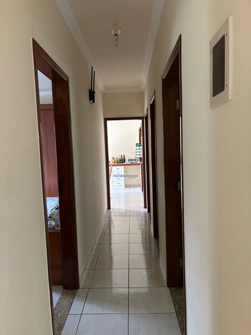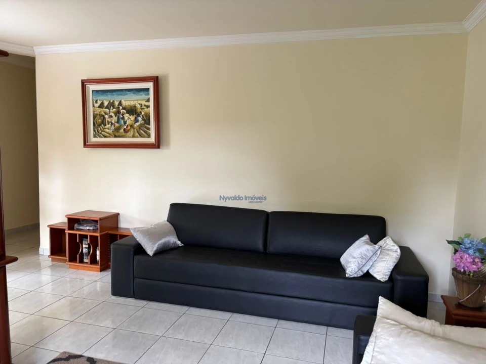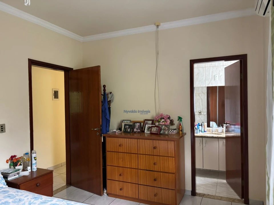 Pavimento térreo: sala de estar, sala de jantar, suíte mais dois dormitórios, cozinha com armário, balcão e pia, banheiro social, área de serviços, despensa, a casa toda em piso cerâmica, e garagem para cinco carros.