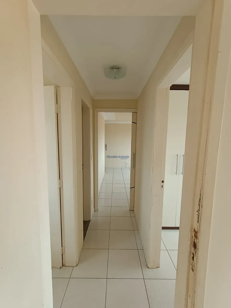 Apartamento com três dormitórios (sendo um deles com armário, escrivaninha e cama de solteiro), sala, cozinha com armários, área de serviços, banheiro com gabinete e box e uma vaga de garagem.