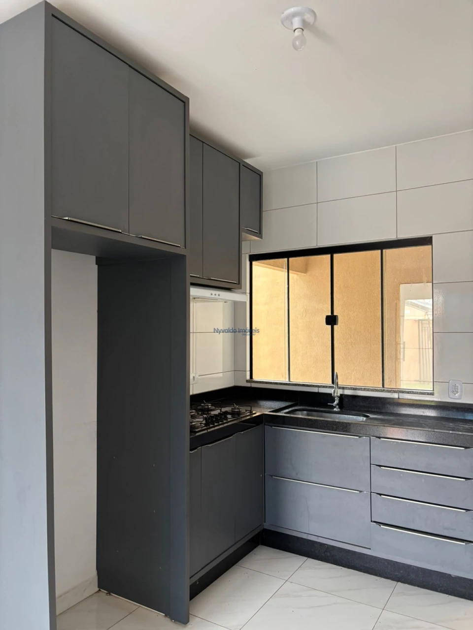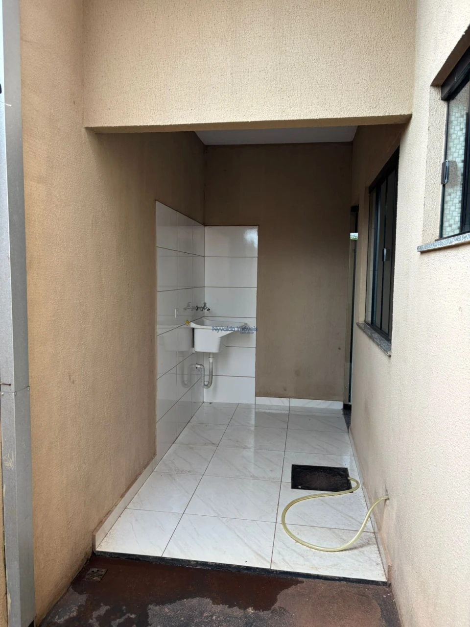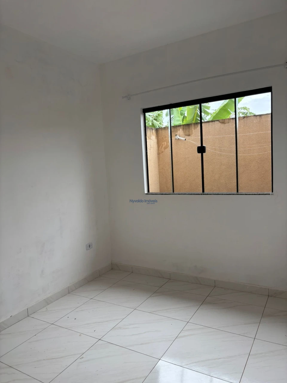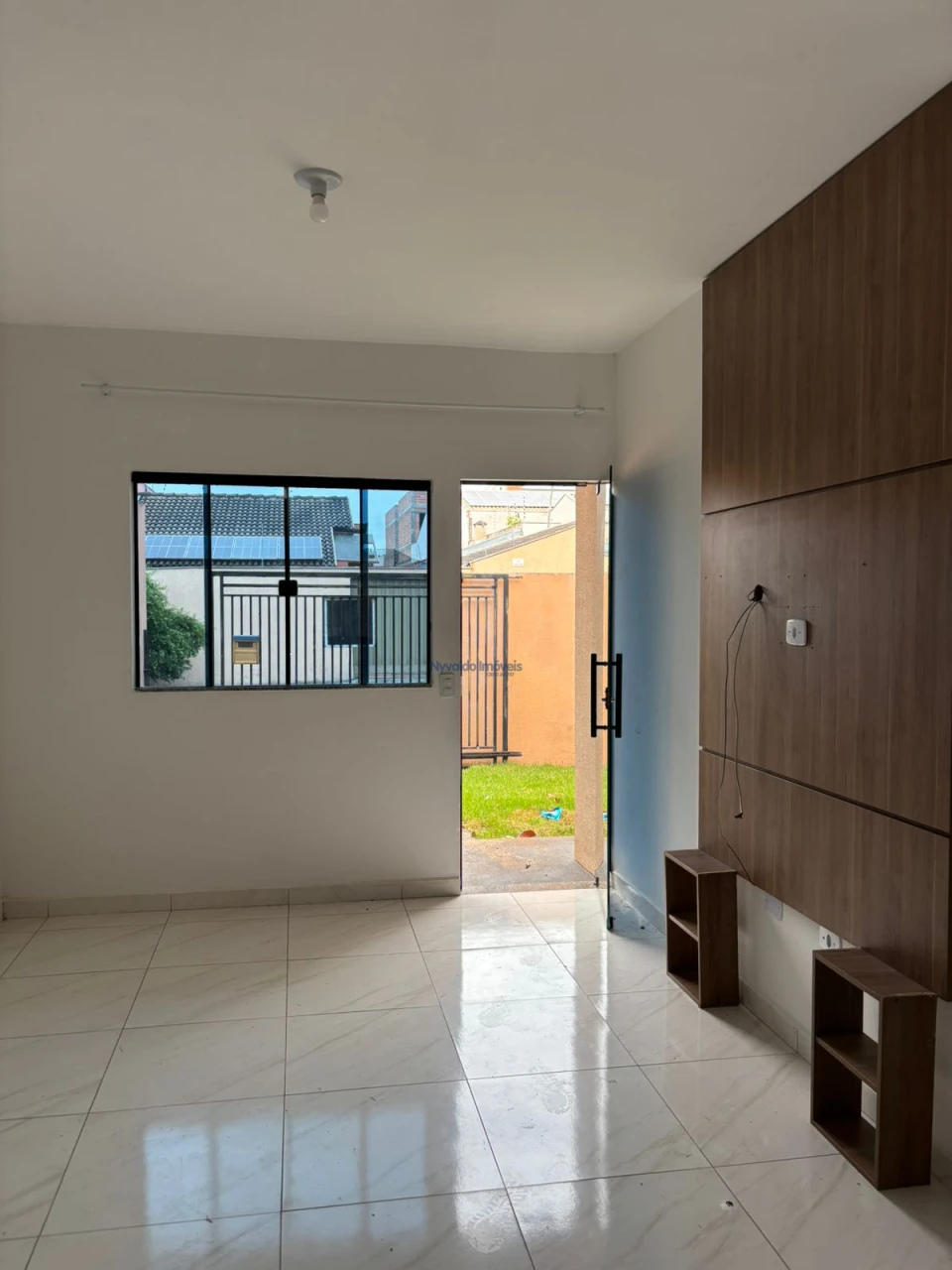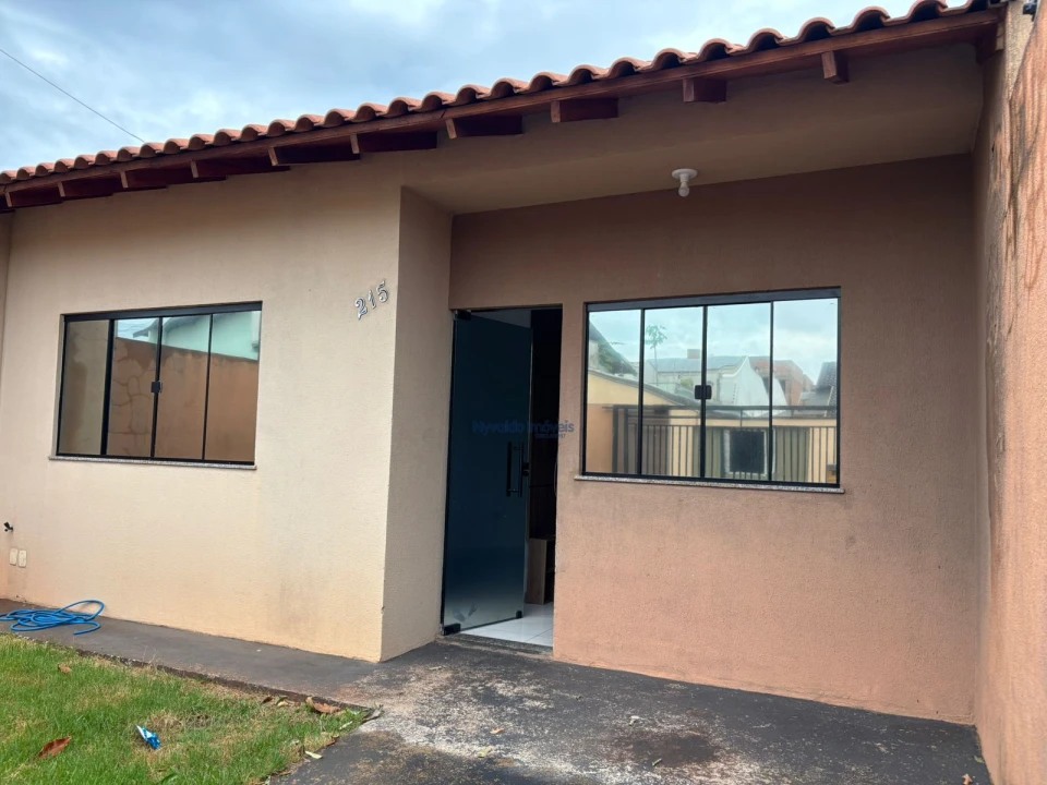 Casa em alvenaria de laje, piso cerãmico, dois quartos um com armário, sala com painel, cozinha com armários, lavanderia, garagem para um carro.
