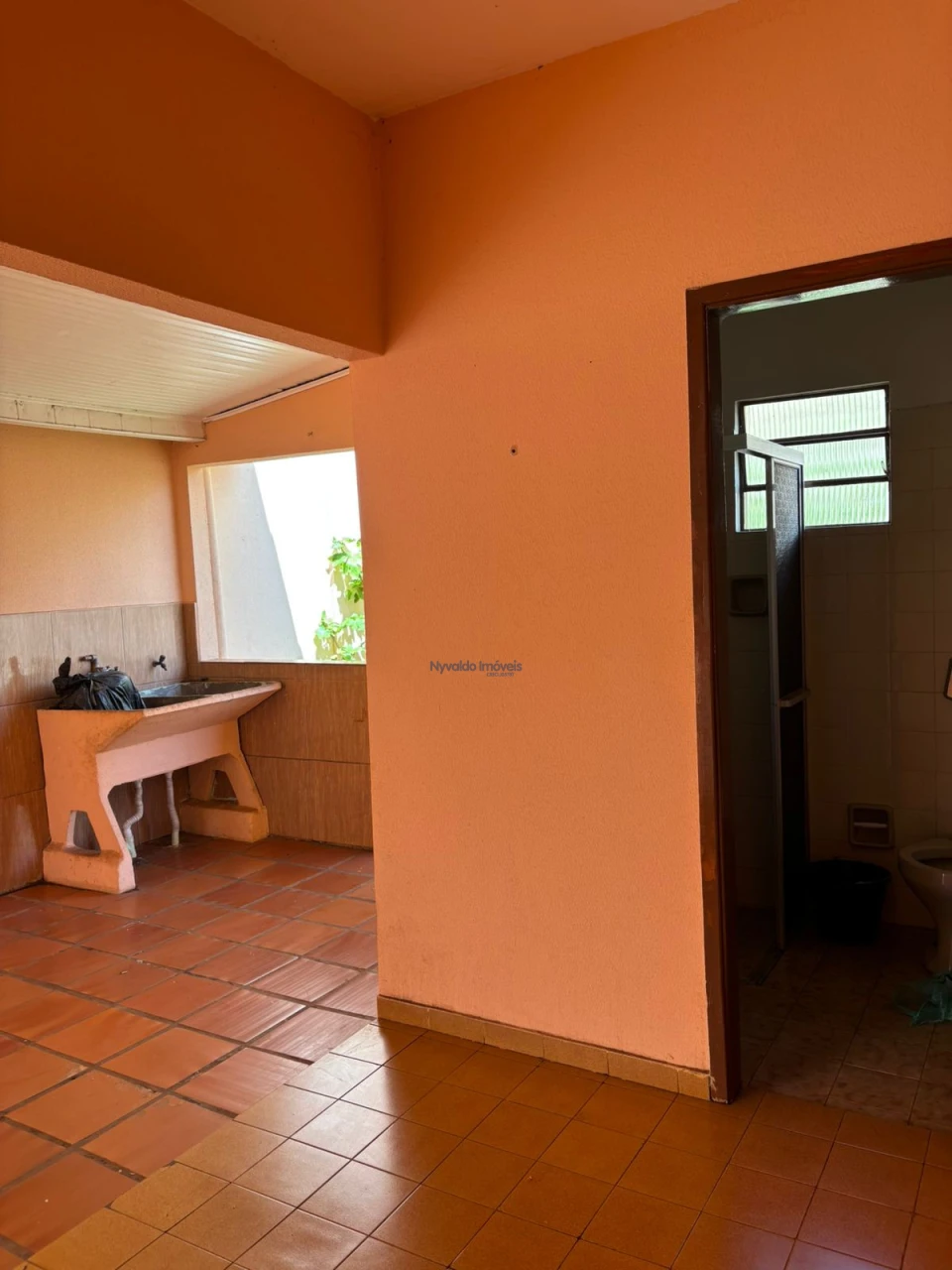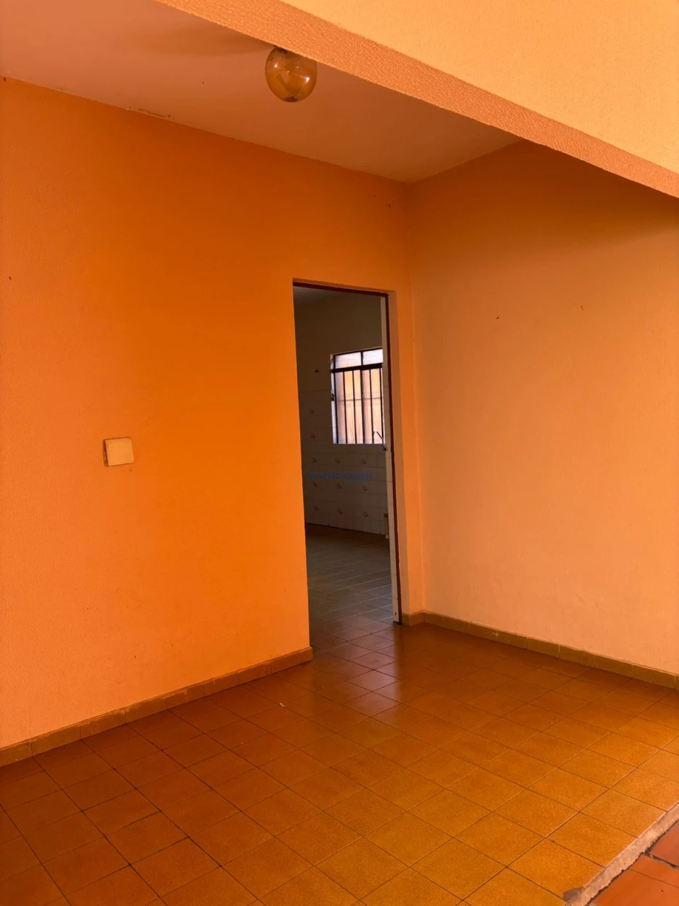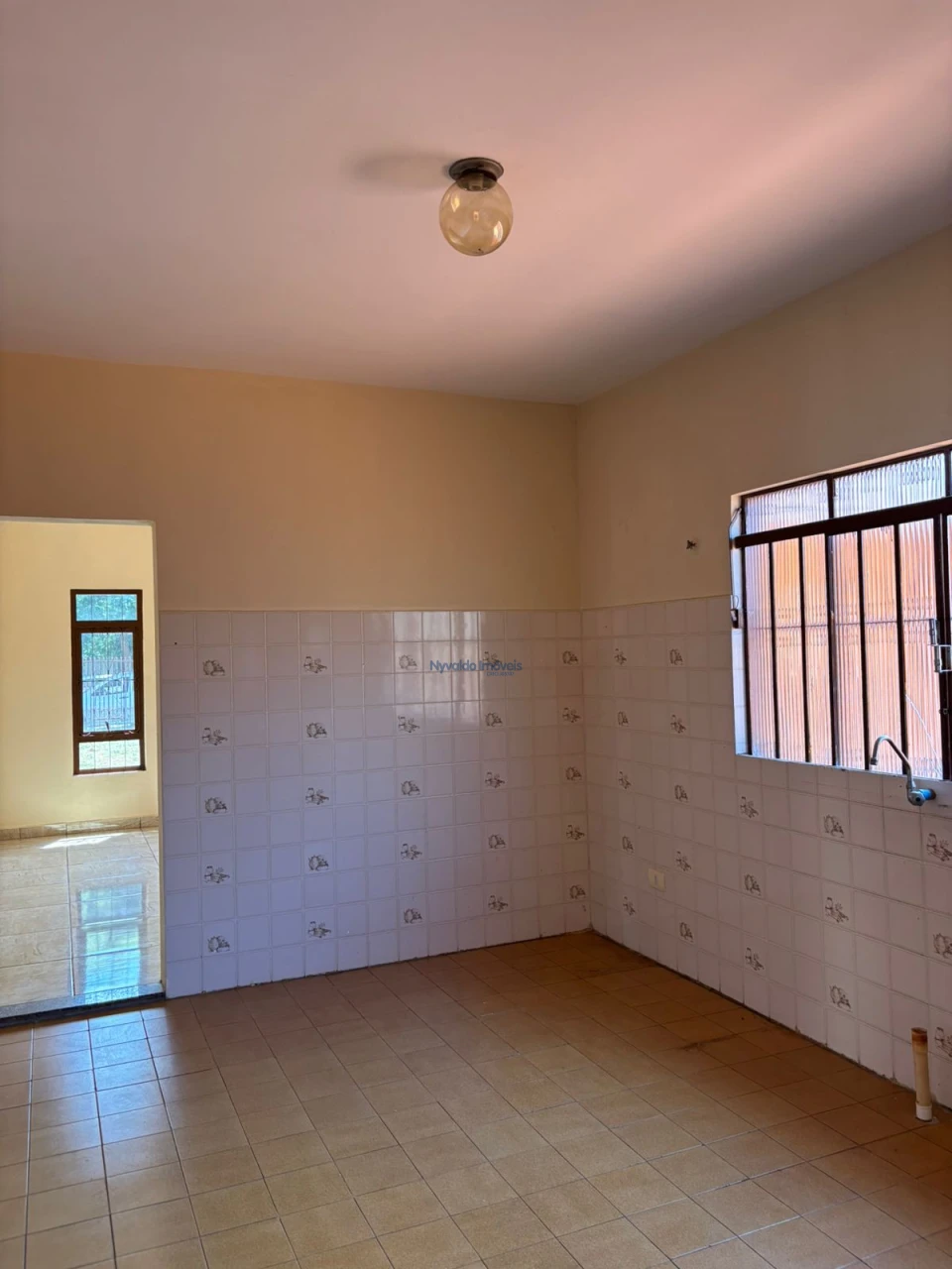 Casa em alvenaria, de laje, piso cerâmica, coberta com telha de barro com dois dormitórios, sala, cozinha, banheiro, área de serviços, banheiro externo e garagem.