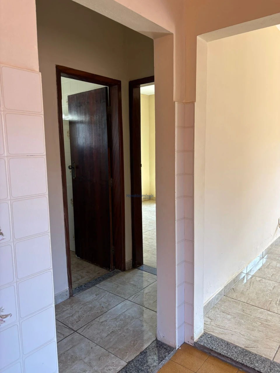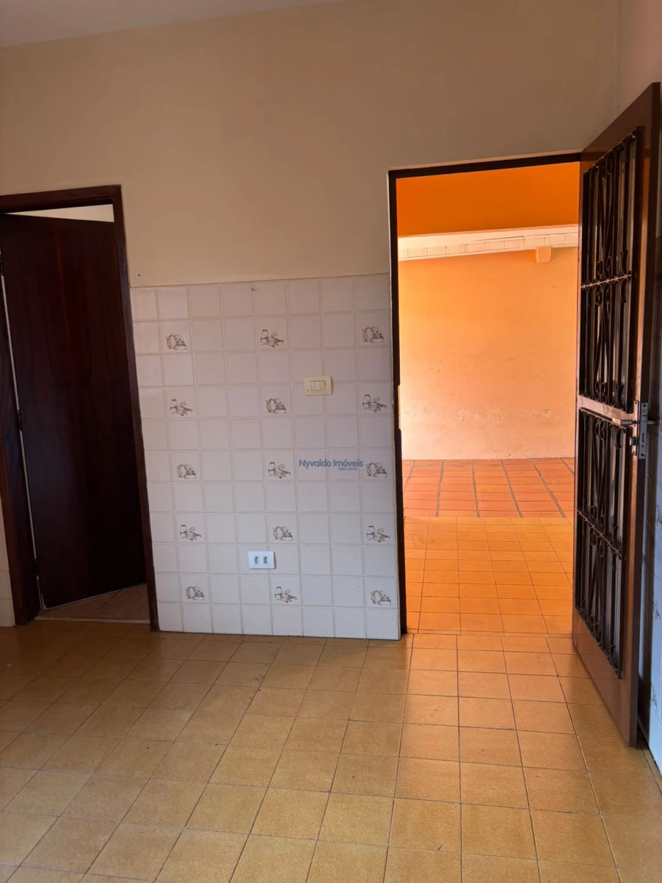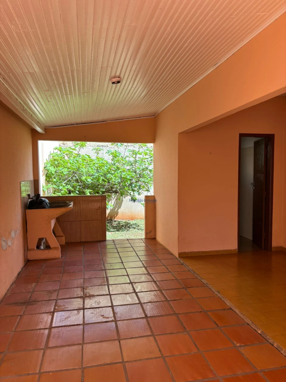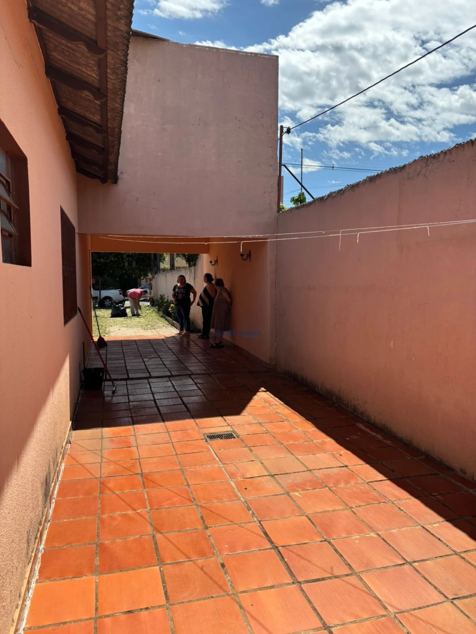 Casa em alvenaria, de laje, piso cerâmica, coberta com telha de barro com dois dormitórios, sala, cozinha, banheiro, área de serviços, banheiro externo e garagem.